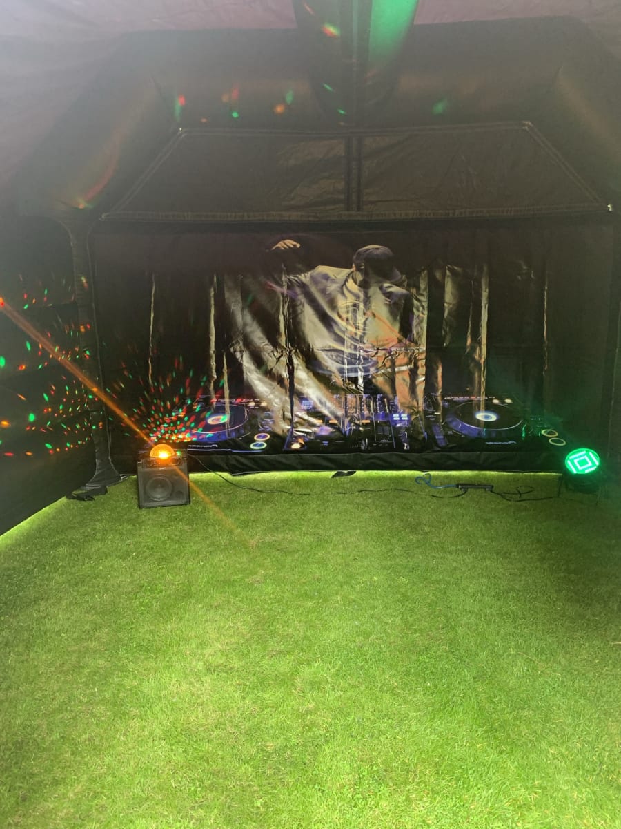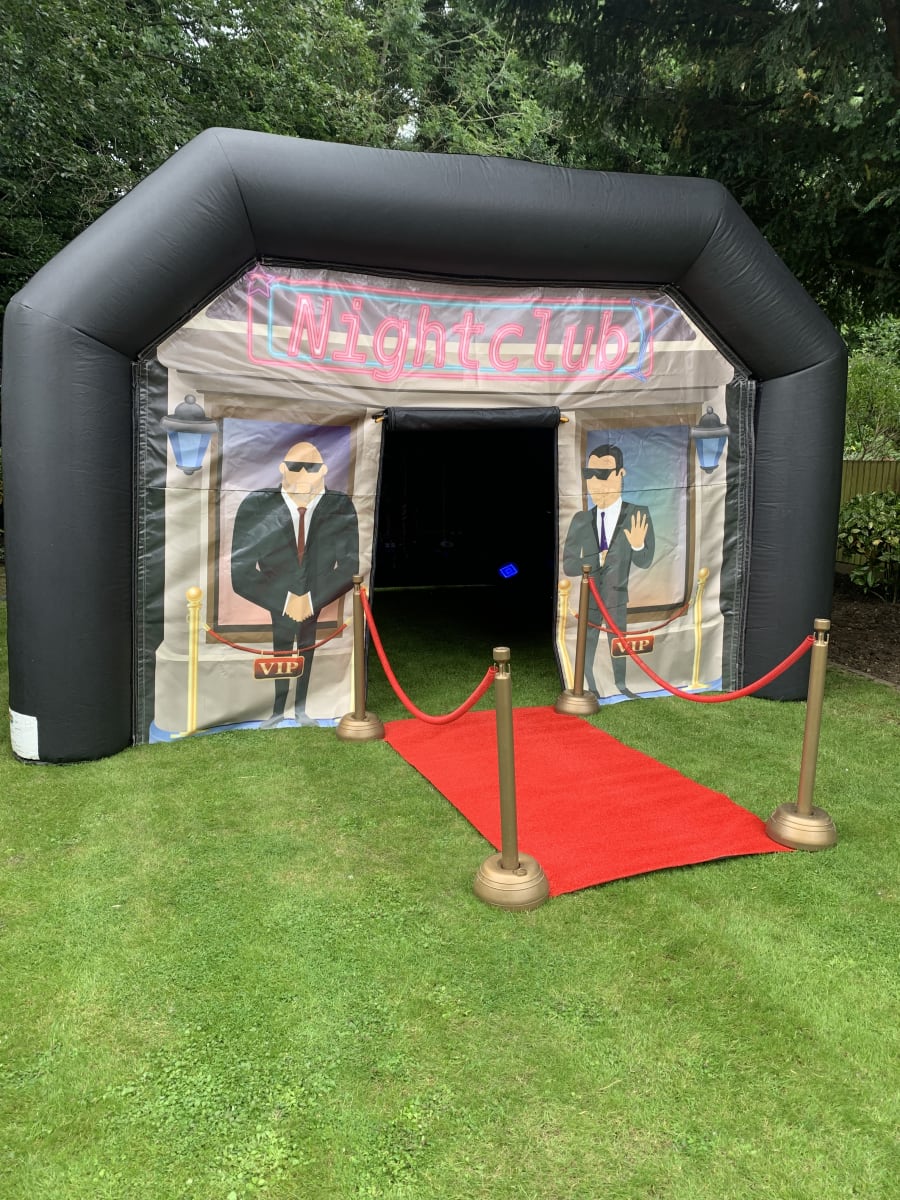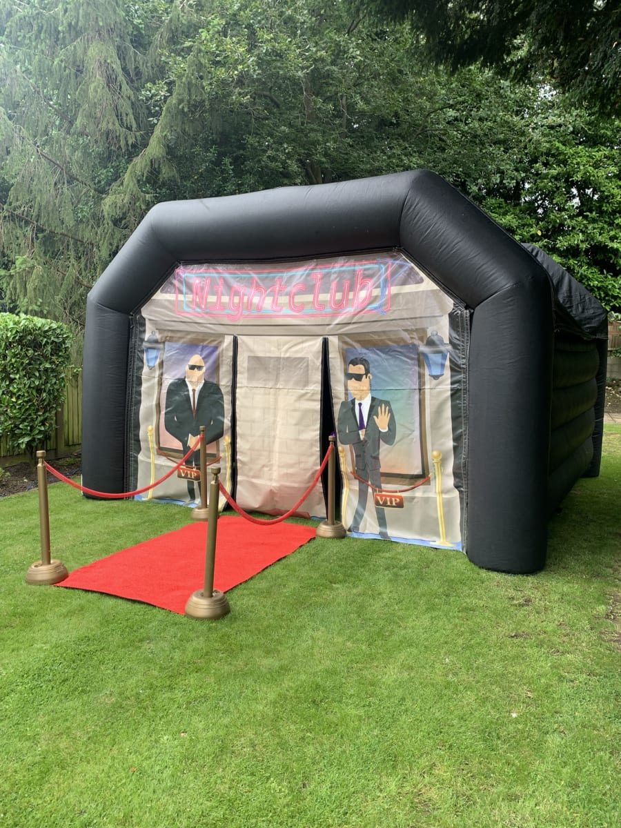 The inflatable VIP disco nightclub is a great addition to any party or event and suitable for children and adults whether it be for a 1st or a 100th birthday. Unlike other disco domes which have an inflatable bouncy floor, the nightclub doesn’t have a floor at all so you will be standing directly on your grass. Included in the hire is our ion 50w powered speaker with a built in revolving disco light and bluetooth connectivity to play your own favorite tunes via an android, iPhone or iPad device, an extra strobe light and the vip red carpet and plastic barriers with ropes.