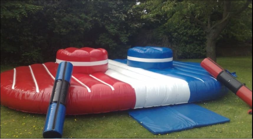 Gladiator Duel Hiring to Chingford, Enfield, North London, Barnet, Hertfordshire and Surrounding Areas Just like the Gladiators TV show this great high energy inflatable is suitable for two competitors at a time and is guaranteed to be a hit at your event. Very popular for party's, school fetes and fund raising events and will keep you entertained for hours of fun whilst trying to knock your opponent off the podium, that's if you can both keep your balance and not fall off before you've even swung the pugil sticks. Made in a colorful blue, white and red stripe with a bed height of 3ft and a podium height of a total of 5ft from the ground. Supplied with padded helmets and both children's and adult pugil sticks in red and blue. Extra safety mats would be needed around this inflatable which would incur a fee if it was to be used on a hard indoor surface, outdoor grass is ideal. For more information or to book this inflatable please Contact Us or call us on 07836551079